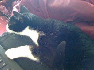 Sometime later something tickled his cheek. Half asleep, he brushed it away, thinking it a fly. Then he realized it was something far more substantial. Opening one eye, he found himself looking directly at the cat, it’s face just inches away, a paw touching his cheek, whiskers tickling his nose. The cat clambered onto his chest. It wriggled to get comfortable, laying its chin on his throat while kneading his neck with its paws. Its claws were sharp against his skin but didn’t puncture it. The cat purred. Evan didn’t dare move for fear of scaring the cat. Soon, the cat lay still. The purring and kneading stopped. He heard quiet, steady breathing. The cat was asleep. He followed soon after.